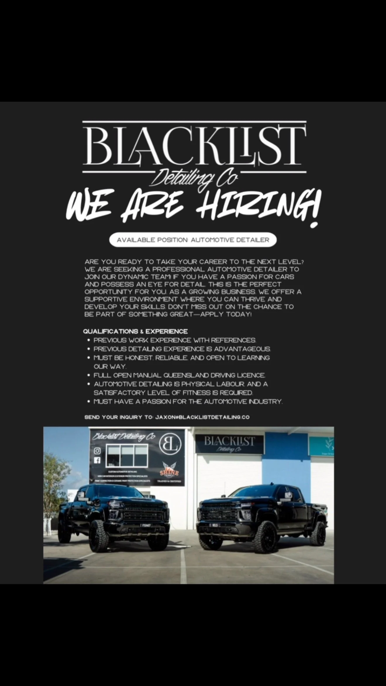 Armed with world-class training, gritty determination, and a vision to raise the bar, Jaxon returned to Australia and poured everything into building what is now Blacklist Detailing Co - the Sunshine Coast’s go-to destination for high-end detailing, ceramic coatings, underbody protection, and vehicle preservation.